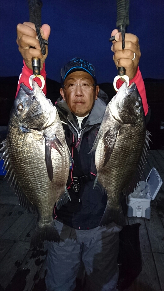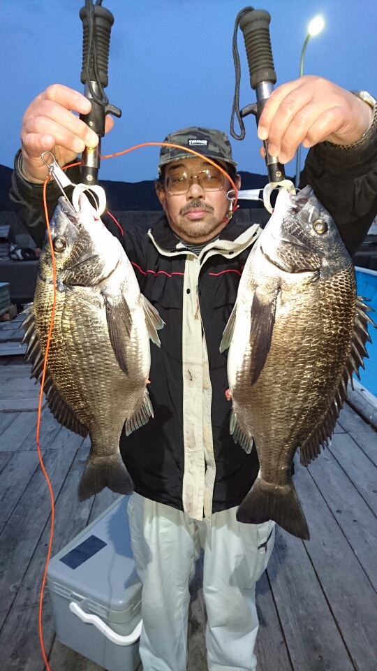 52㎝ 43㎝ 餌・沖アミ 河合氏 あみほし場にて‼4時半頃の釣果です(^-^)v 46㎝ 43㎝ 餌・ボケ 中口氏 江崎筏にて‼明日の大会筏です‼ 41㎝ 餌・ボケ 早川氏 オクチ筏にて‼5時前の落とし込みでGETです(^-^)v