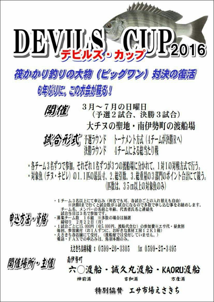 デビルズ・カップ開催の詳細告知が 「えさきち」さんのHP筏イズムにて 発表されました!! エントリーを希望される方は 2月22日迄に応募して下さい‼ 宜しくお願い致しますm(__)m -