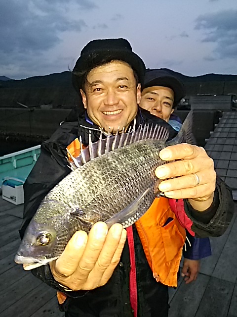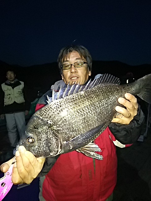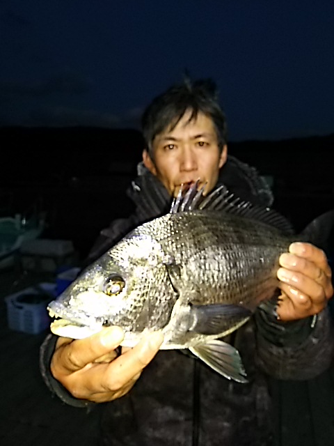 初筏チヌ!!おめでとうございます‼ それも弁天筏35mにて‼今日は、大袈裟な天気予報の風予測に騙された1日でした(^_^;) 36㎝ 餌・ボケ 松岡氏 やりましたねぇー\(^-^)/ -
